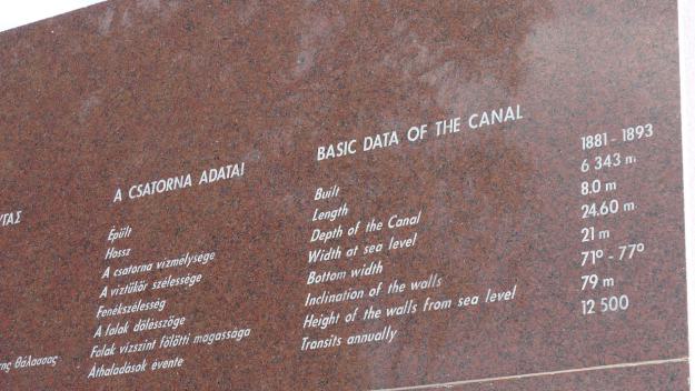 Bild einer Tafel am Rand des Kanals von Korinth mit den Daten des Kanals
