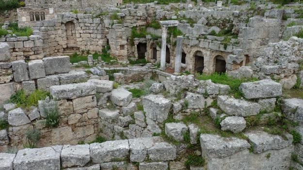 Blick auf die Agora von Korinth. Im Hintergrund ist die byzantinische Kirche des Justin I. zu sehen.
